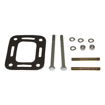 The kit includes two long bolts and two short bolts, providing all the necessary hardware for secure installation of riser elbows to the exhaust manifold.